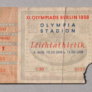 Giornata del 4 agosto dalle ore 10.30 alle ore 15.00,stampa a col., 10 x 6,8 cm, nell’angolo in basso adestra strappo di convalida per l’ingressoProvenienza: Collezione privataIl biglietto conservato si riferisce all’ingresso allo stadio olimpico per le gare di atletica del 4 agosto 1936. In quella giornata il grande atleta statunitense di colore Jesse Owens…