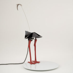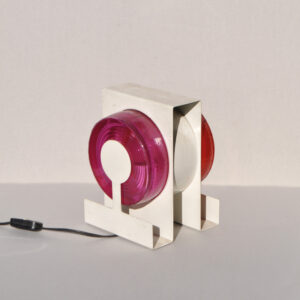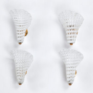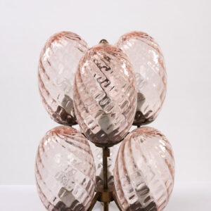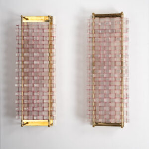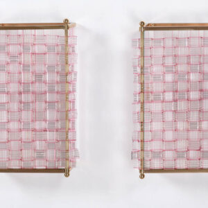 Listelli lineari e ondulati in vetro zigrinato trasparenti color rubino, struttura in ottone, H. 51 x 33 x 10,5 cm. Elementi provenienti da un grande lampadario realizzato dalla Seguso Vetri d’arte Murano per l’Hotel Bristoldi Merano. Struttura nuovaProvenienza: Asta Hotel Bristol 2010, collezione privata