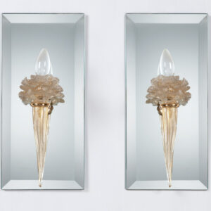 Vetreria Gino Cenedese Murano – Coppia di applique con specchio Hotel Bristol Merano, 1953/54Quick viewCornucopia e tazza a forma di garofano in vetro/oro, specchio in vetro molato, H. 27 cm, specchio 20 x 43 cm, impianto elettrico da rifareProvenienza: Asta Hotel Bristol 2010, collezioneprivata