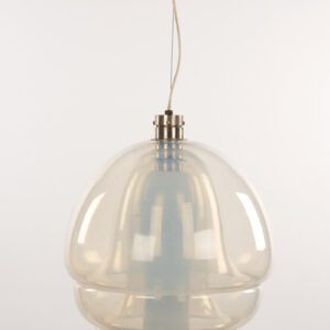 Listelli lineari e ondulati in vetro zigrinato trasparenti color rubino, struttura in ottone, H. 86 x 32 x 11 cm. Elementi provenienti da un grande lampadario realizzato dalla Seguso Vetri d’arte Murano per l’Hotel Bristol diMerano. Struttura nuovaProvenienza: Asta Hotel Bristol 2010, collezione privata