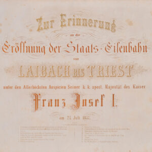 Anonym/Anonimo – Albo sEröffnung der Staats-Eisenbahn von Laibach bis Triest 1857Quick viewAlbo sZur Erinnerung an die Eröffnung derStaats-Eisenbahn von Laibach bis Triestam 27. Juli 1857 unter den AllerhöchstenAuspicien Seiner k. k. apost. Majestätdes Kaiser Franz Josef I.s, Trieste, 1857Con testi di descrizione storico-tecnica, planimetriedella situazione e del profilo longitudinale delpercorso e 14 litografie a colori di vedute del percorso(Lubiana, Werth, Adelsberg, Nabresina, Grignano,S. Bartolomeo, Trieste...) degli…