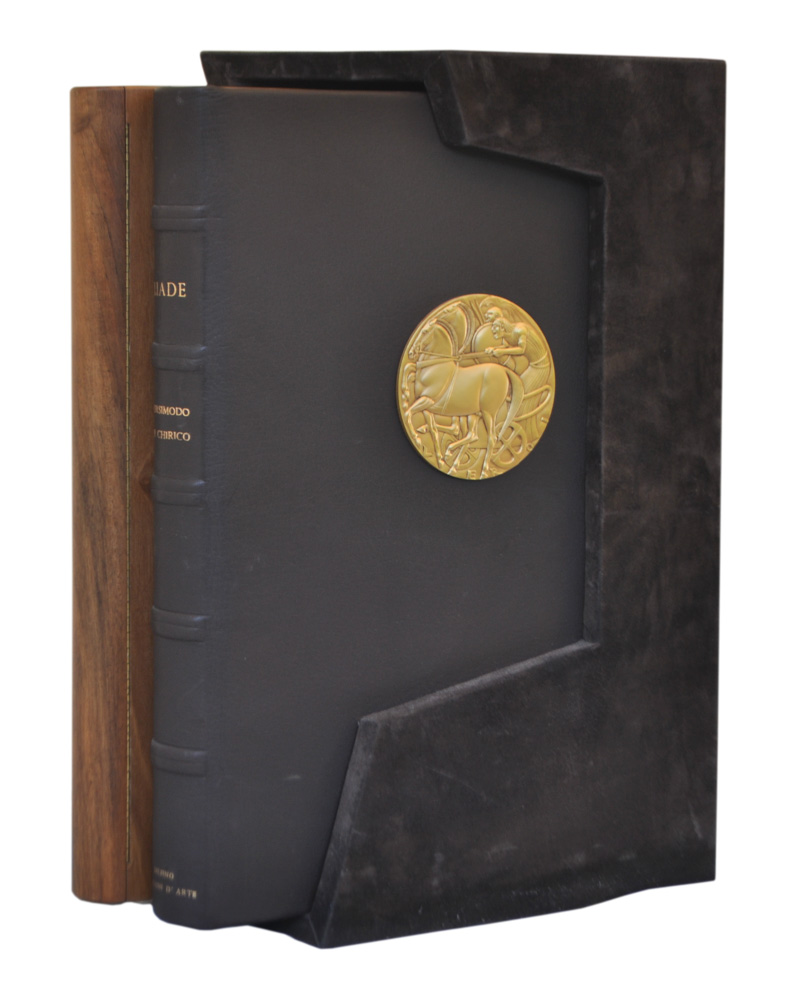 Volume con testo, 145 pagine, 50 x 35 cm, legatura editoriale in piena pelle con scultura in bronzo a basso rilievo di Guido Veroi applicata