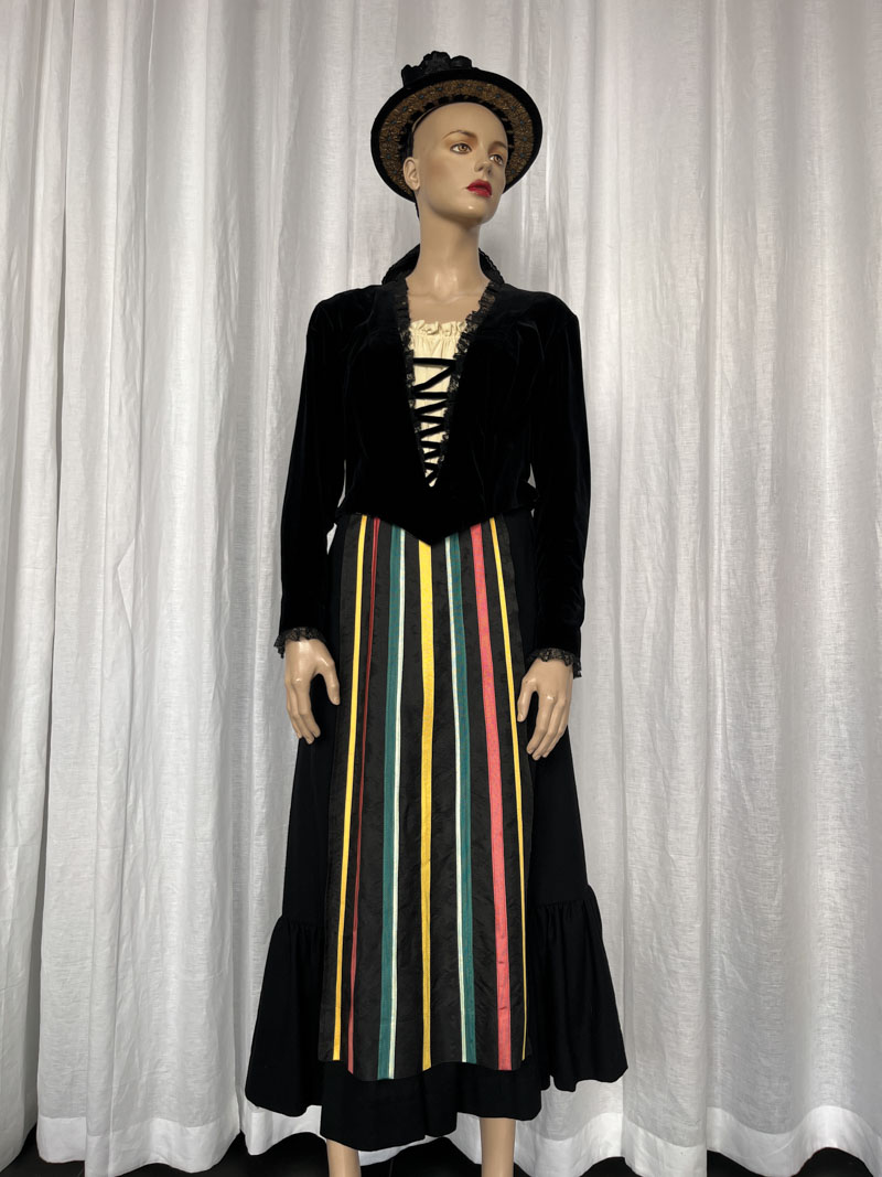 Oberteil aus Samt, Rock aus Tuch, Streifen mit bunten Bändern,
