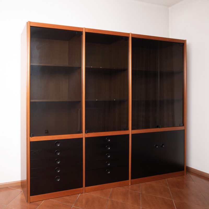 Struttura in legno, 3 ante con vetro, cassetti interni, h. 210 x 41 x 230 cm
