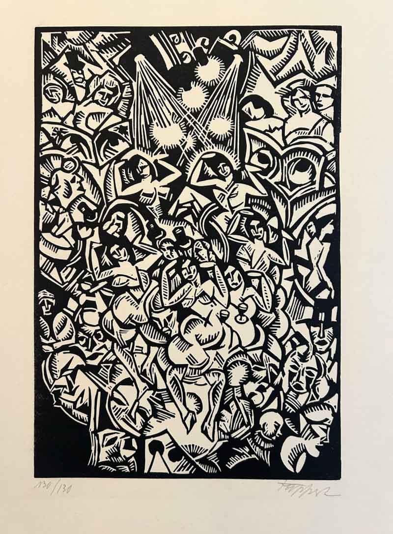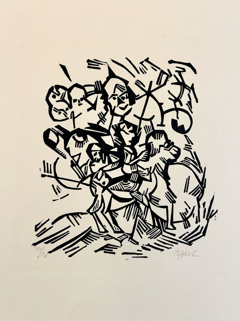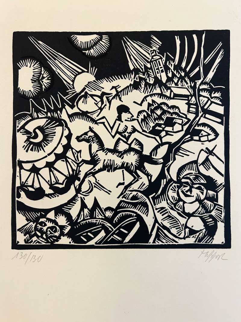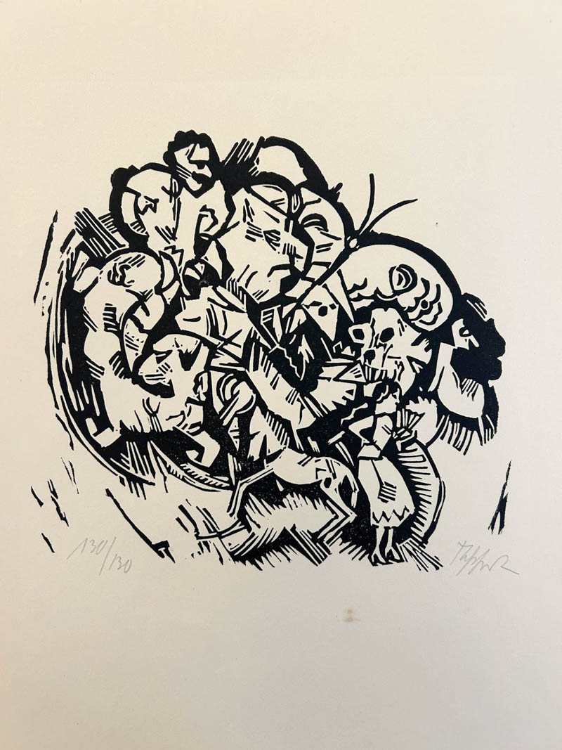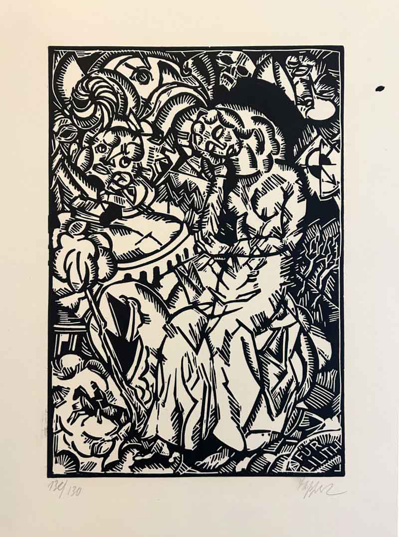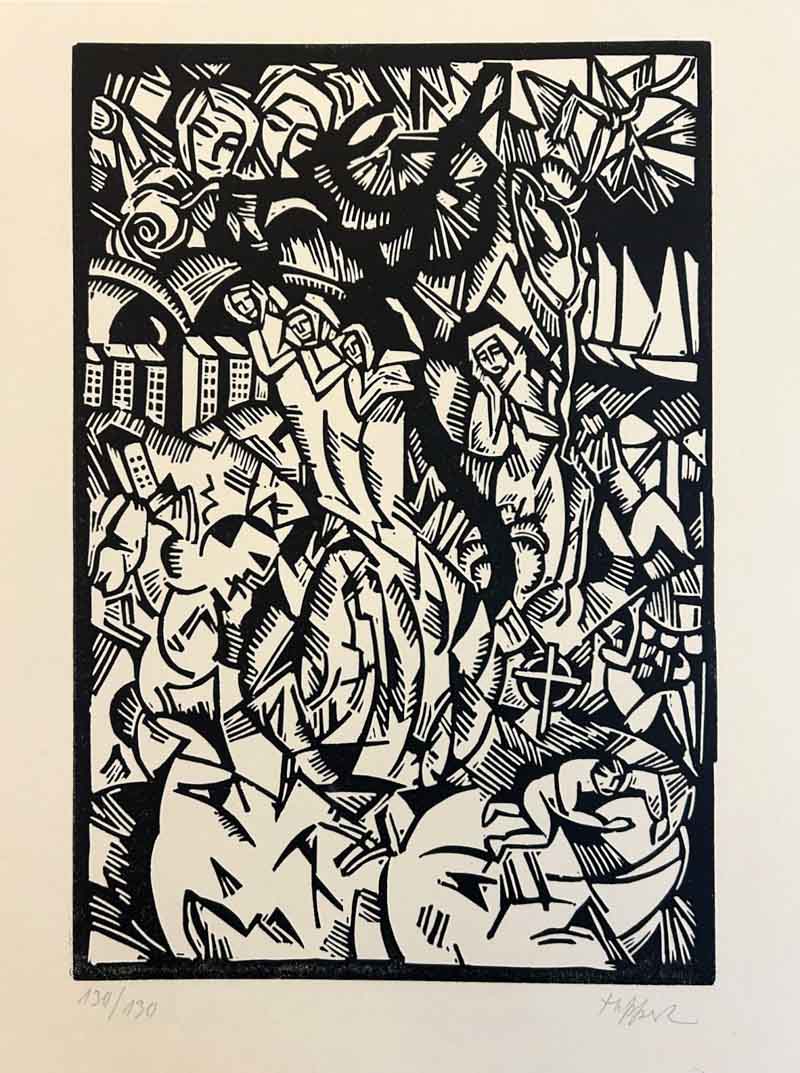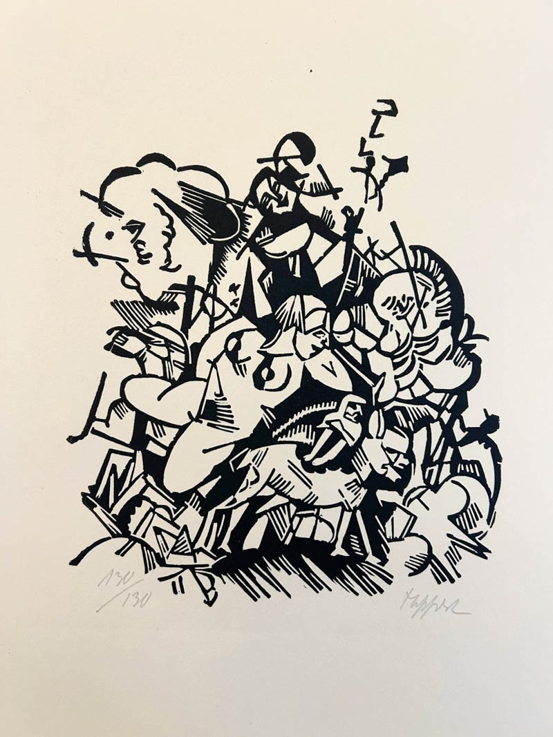 Mappe mit 8 Holzschnitten in Schwarz-Weiß, jeweils ca. 48 x 38 cm, illustrierte Ausgabe des Gedichts von Theodor Däubler, herausgegeben von der ‚Galerie Flechtheim Düsseldorf‘. Einband abgenutzt mit Gebrauchsspuren, Holzschnitte in sehr gutem Zustand