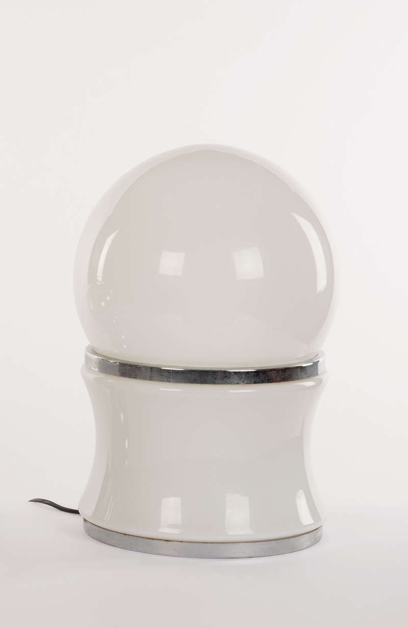 In vetro opalino e metallo cromato, h. 43 x 35 cm, lievi abrasioni ai cerchi