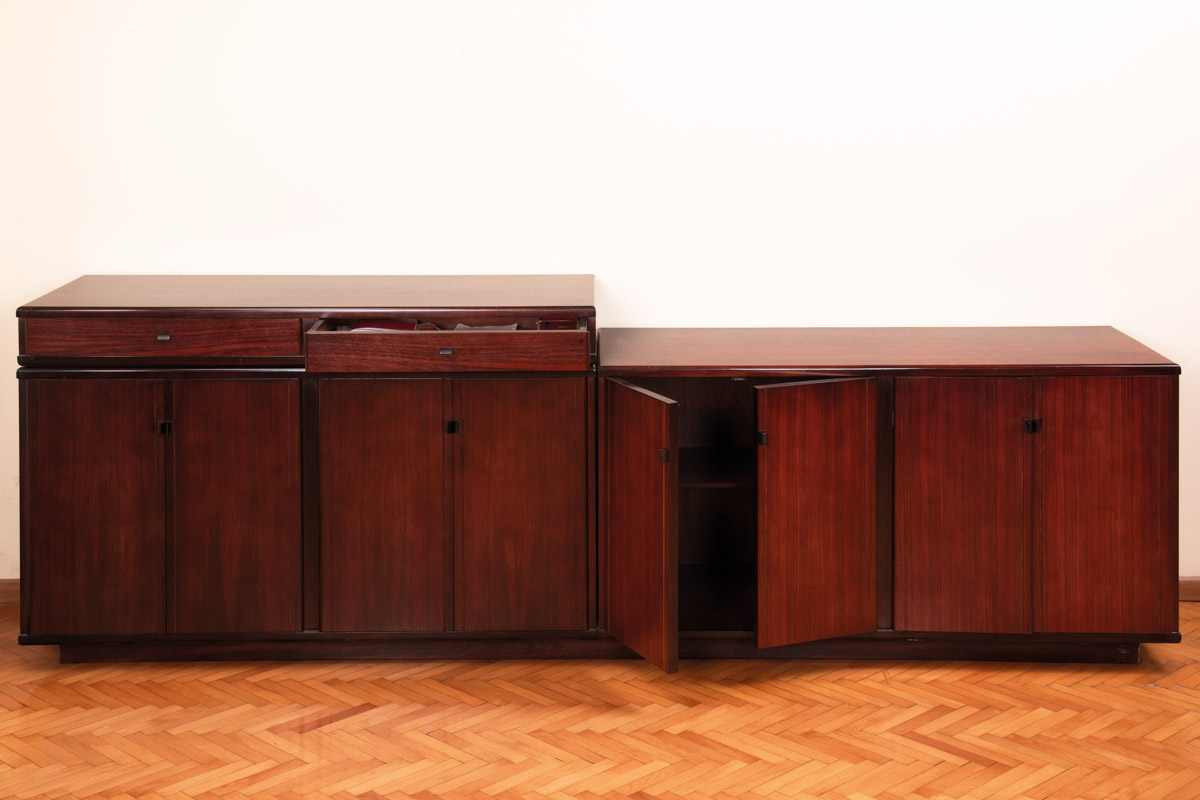 2 moduli in legno, 4 ante e cassetti interni, h. 74 x 132 x 51 cms h. 89 x 132 x 51 cm